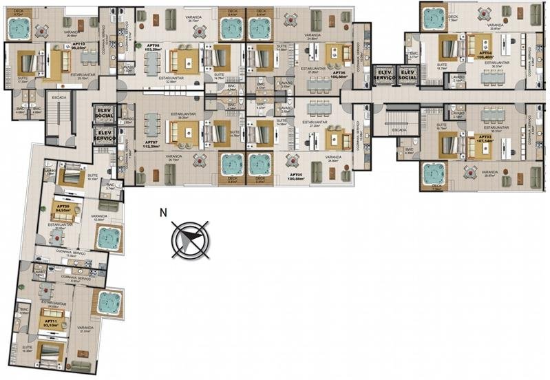 - Cobertura com 01 suíte (possibilidade de mezanino), Sala de Estar/Jantar, Lavabo, Cozinha com varanda/terraço integrados, Deck, Ofurô privativo, WC social. 93,10m²