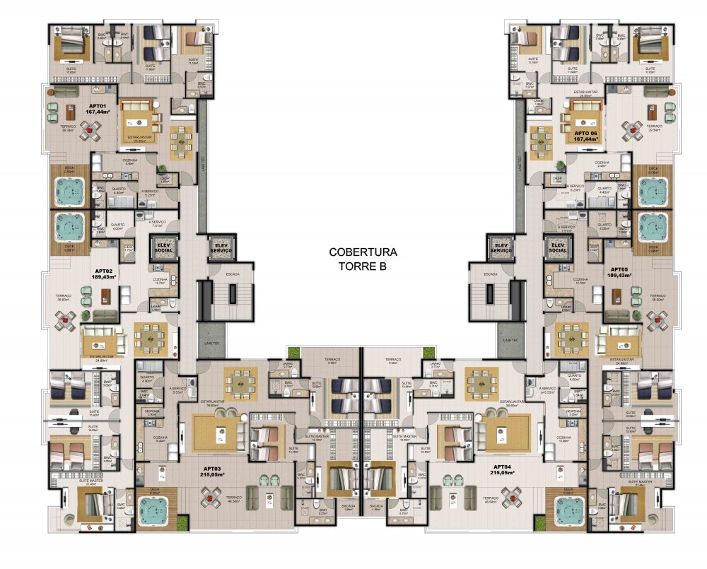 - Cobertura com 03 suítes, DCE completa, Sala de Estar/Jantar, Lavabo, Cozinha com despensa e Varanda Gourmet integrada, Área de serviço, Terraço, Deck e Ofurô privativo. 167,44m²