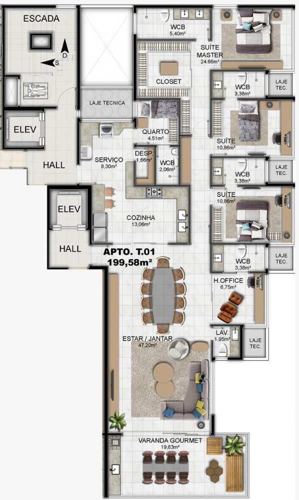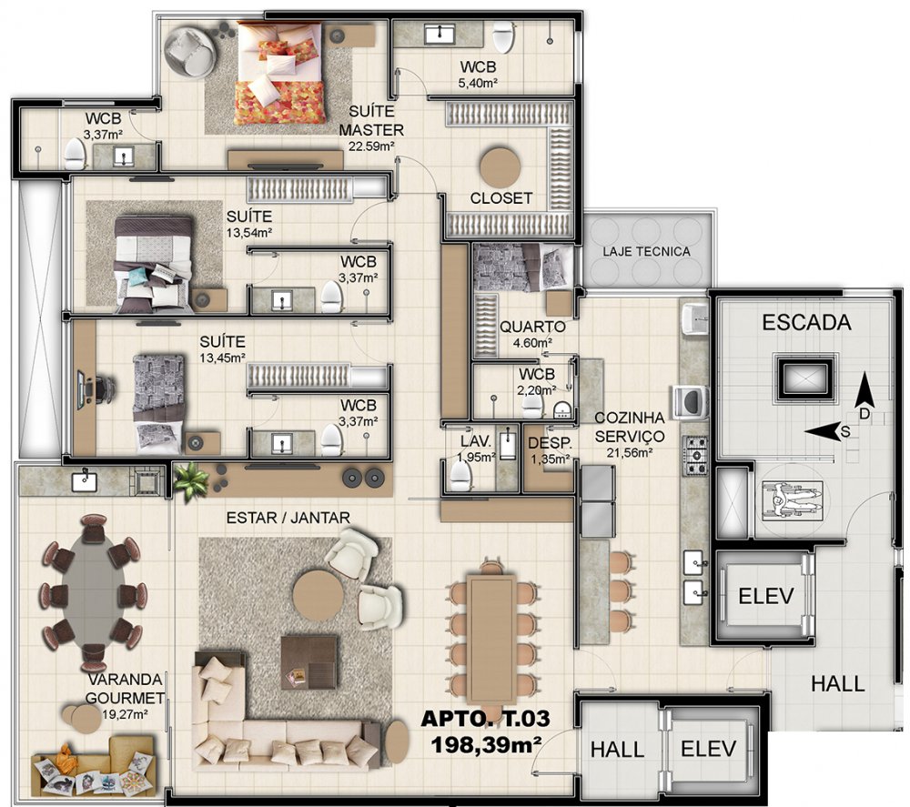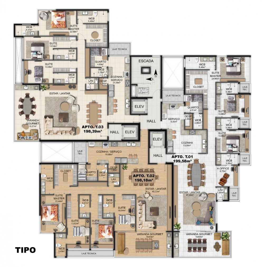 - 04 suítes sendo 01 master com closet, DCE completa, Sala de Estar/Jantar, Lavabo, Varanda Gourmet, Cozinha com despensa e Área de serviço. 198m²