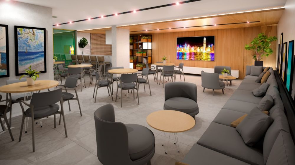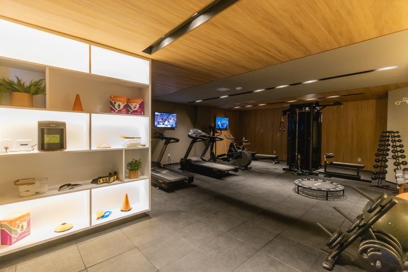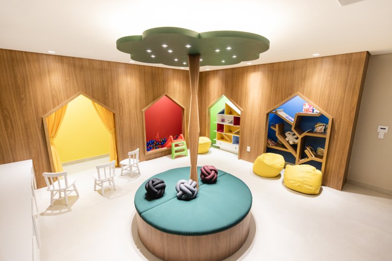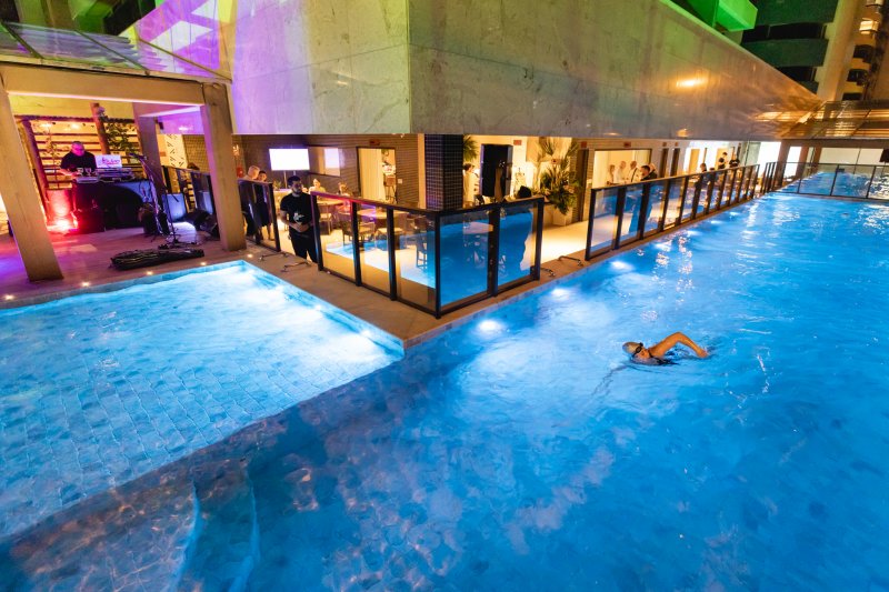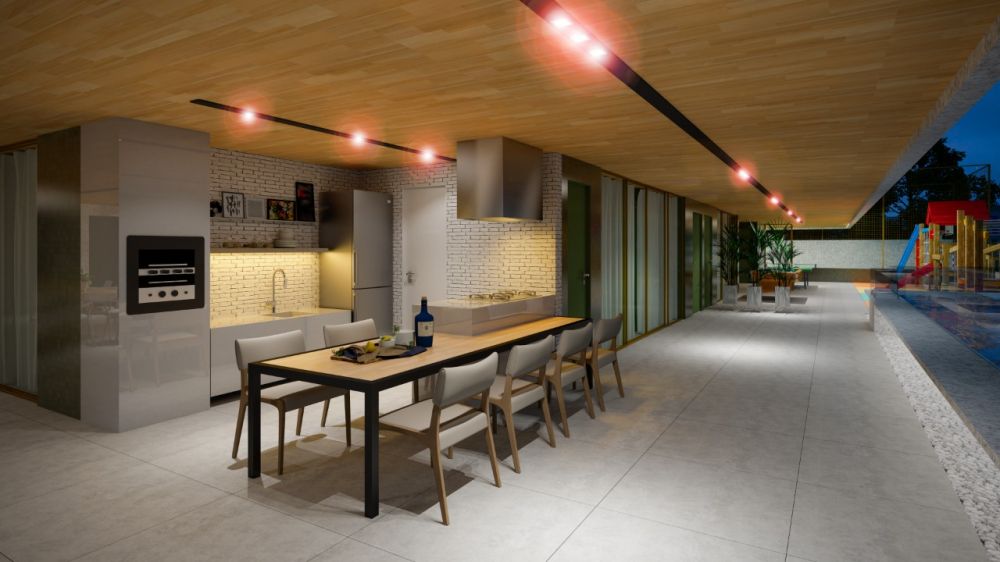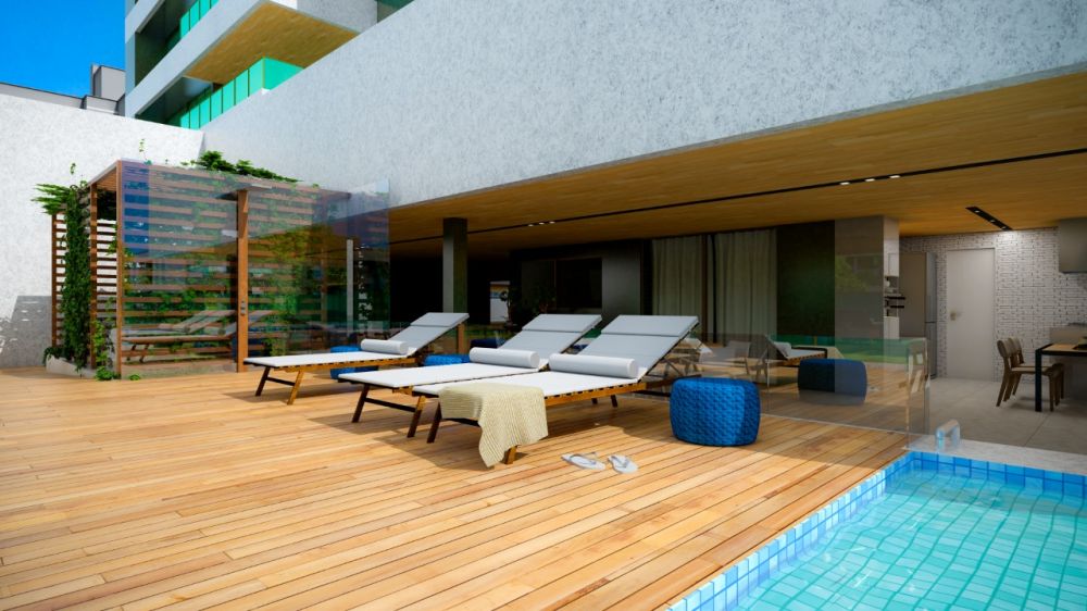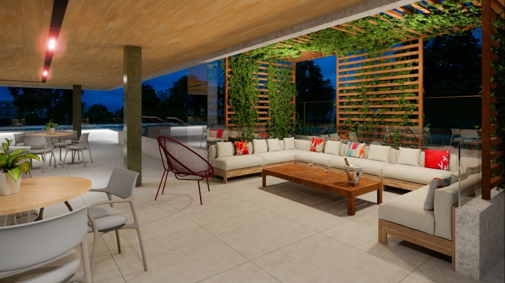 Lounge integrado ao deck da piscina, salão de festas e ao espaço grill
