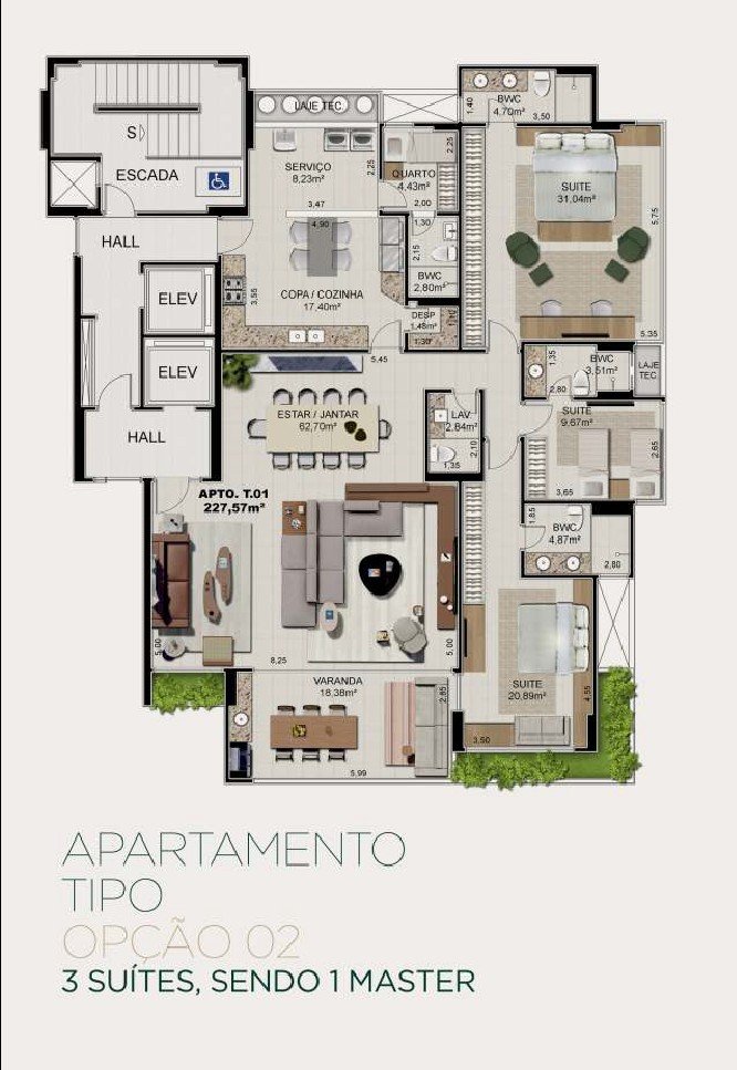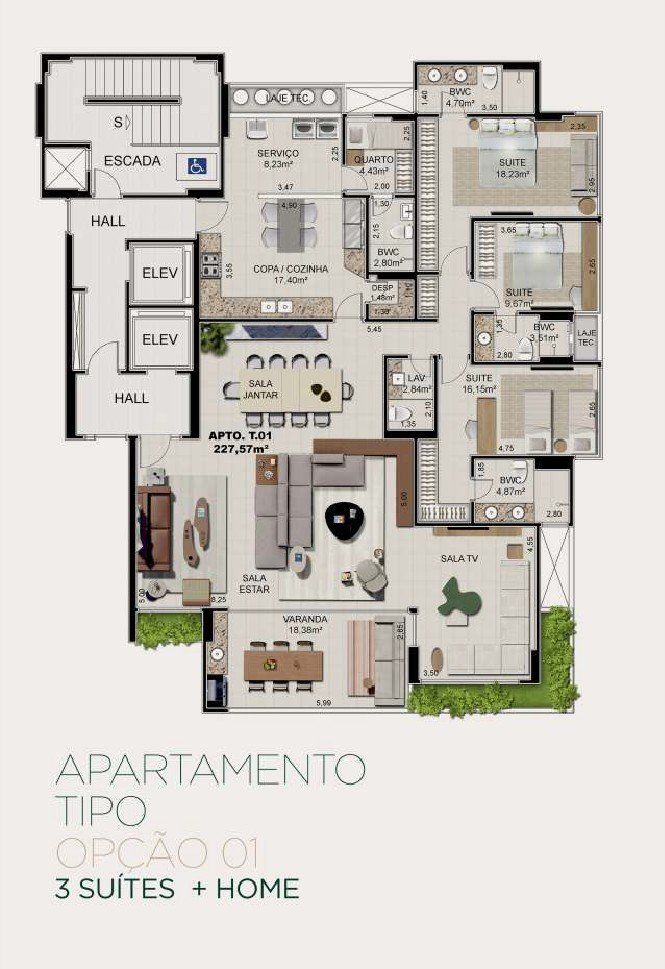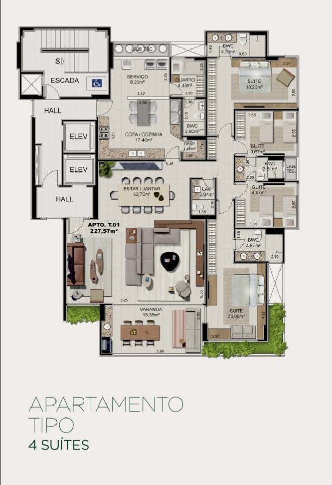 - 02 a 04 suítes, DCE, Sala de estar/jantar, Lavabo, Varanda, Cozinha com copa e Área de serviço. 227,6m²