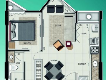 - Quarto/sala sendo 01 quarto sendo 01 suíte reversível, Sala de estar/jantar, cozinha e área de serviço. 44,21m²