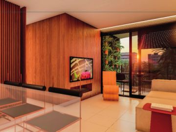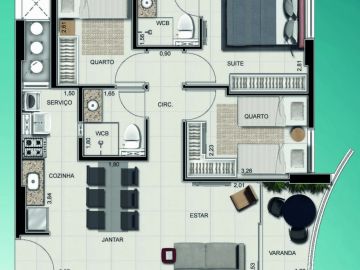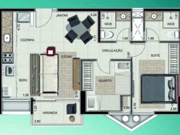 - 02 quartos sendo 01 suíte, Sala estar/jantar, WC social, Varanda, Cozinha e Área de serviço. 58,66m²