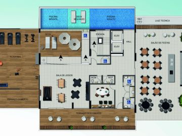 Piscina adulto e infantil com deck molhado e seco