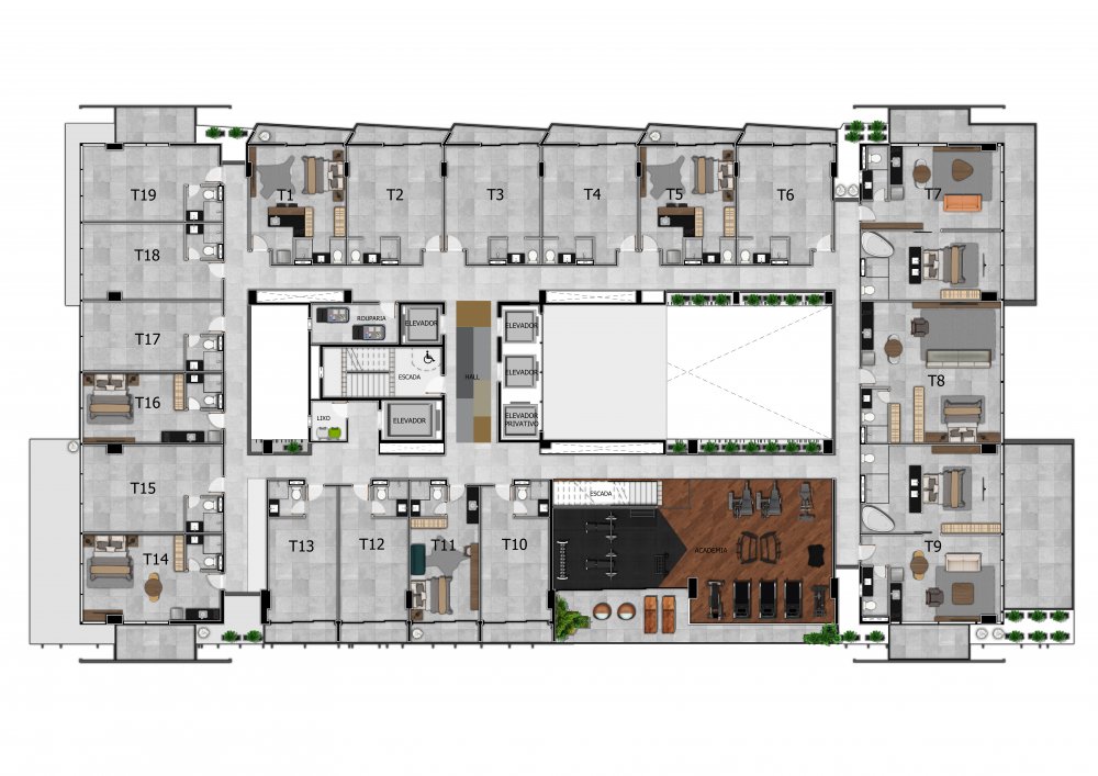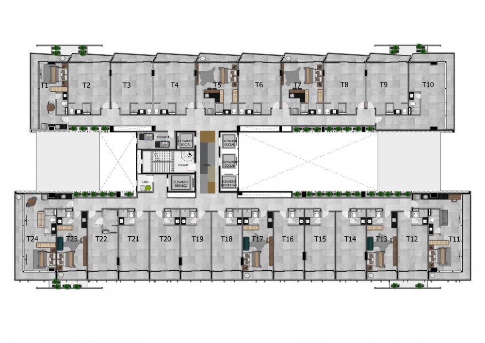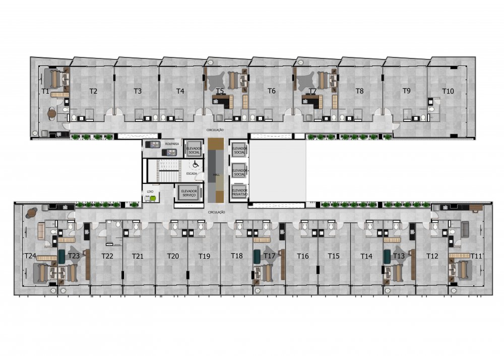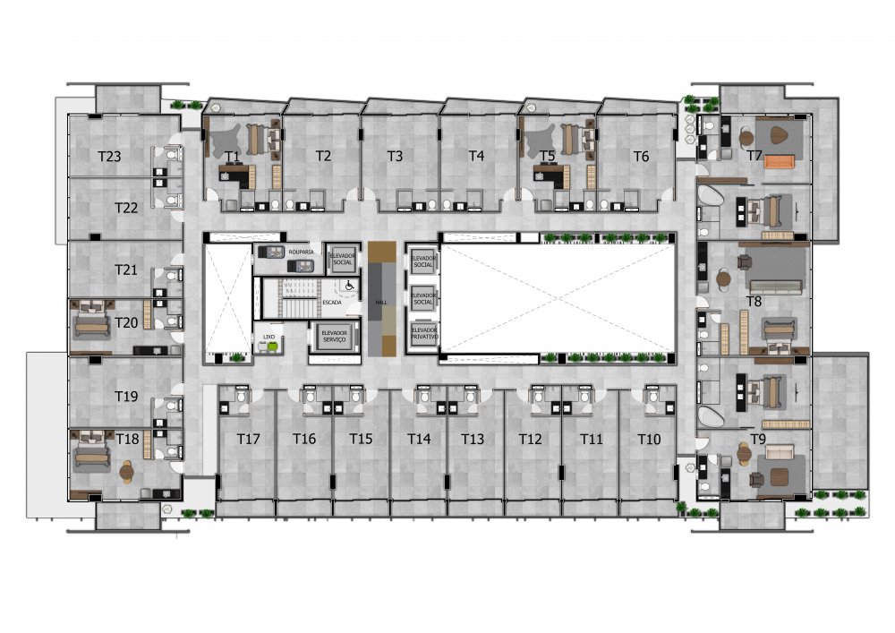 - Quarto/Sala 01 quarto, Sala de Estar/Jantar, WC social e Cozinha 55,79m²