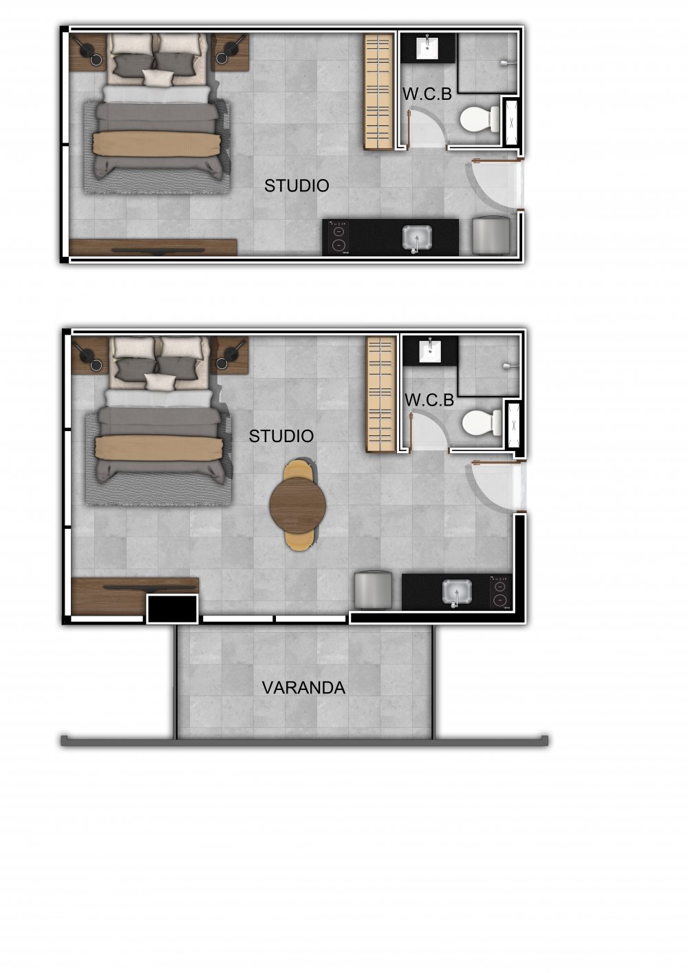 - Studio Sala conjugada com quarto, WC social e Cozinha 31 a 36m²