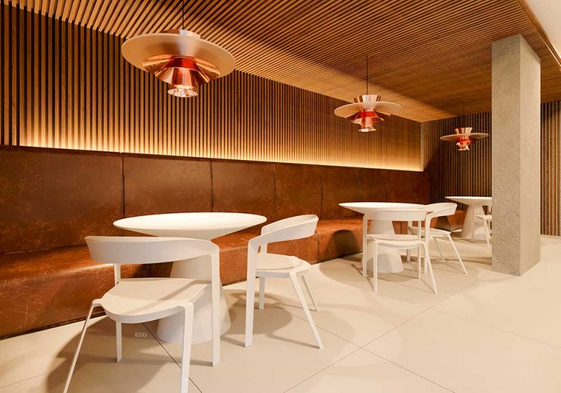 Pérgola da piscina com chuveirão, espreguiçadeiras, mesas com cadeiras e sombrinhas; lounge com mesas, cadeiras e puffs; lounge coberto com mesas, cadeiras e puffs, anexo a piscina, e banheiros