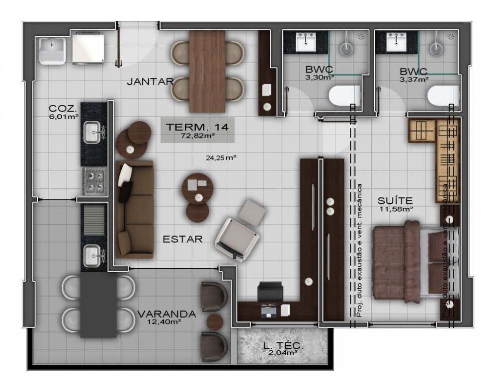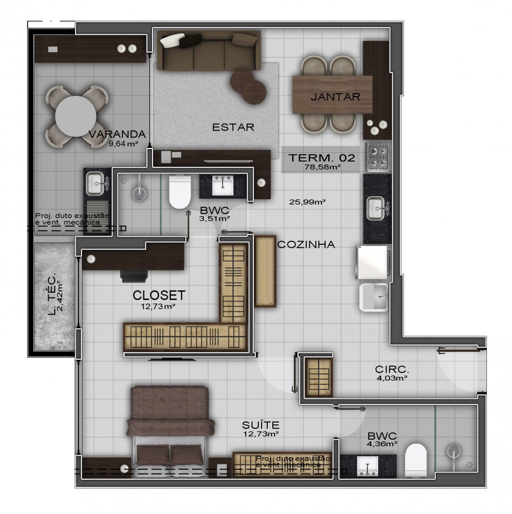 - 02 quartos sendo 01 suíte, Sala de Estar/Jantar, Varanda gourmet, Cozinha e Área de serviço. 73,31m²