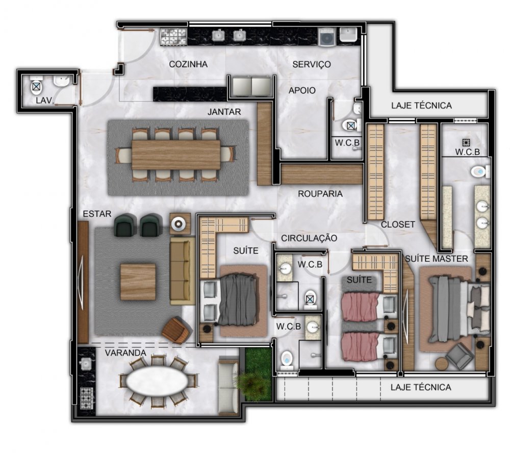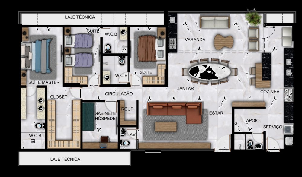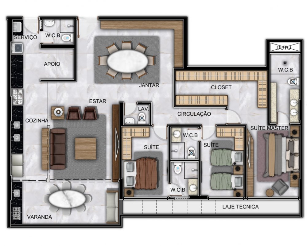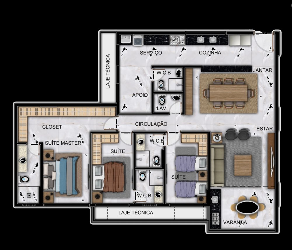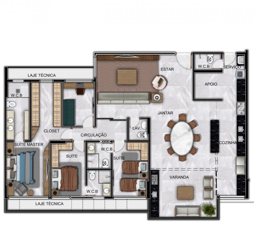 - 03 suítes sendo 01 master, DCE completa, Sala Estar/Jantar, Varanda gourmet, Lavabo, Cozinha e Área de serviço. 155m²