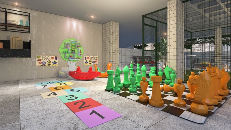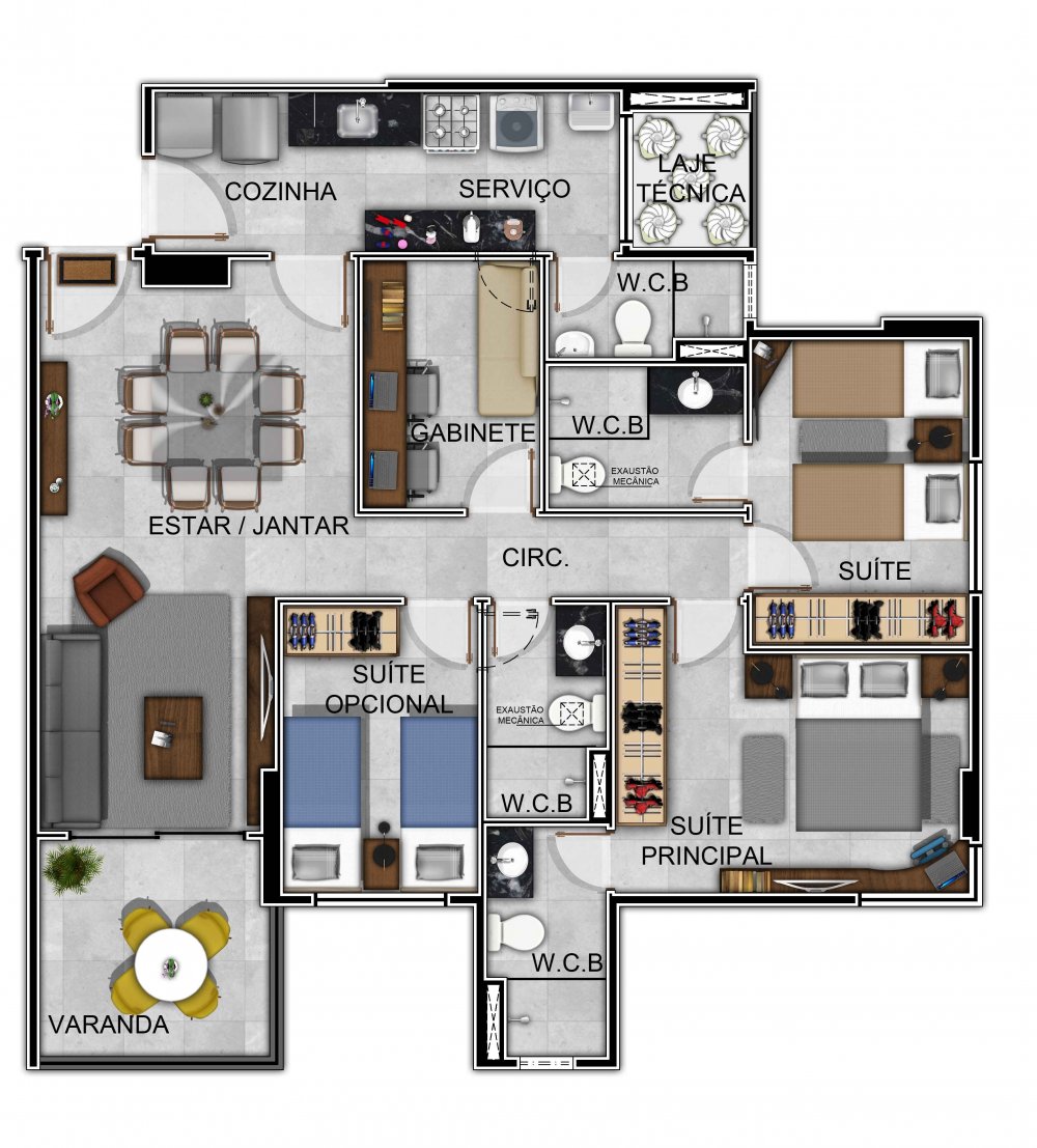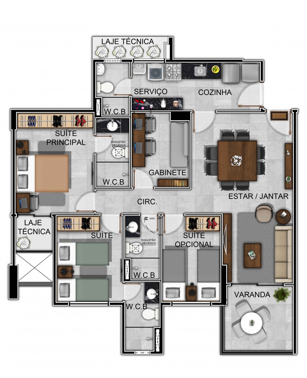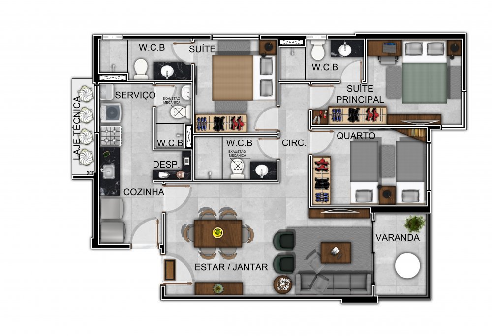 - 03 quartos sendo 02 suítes, Sala de Estar/Jantar, Varanda, WC social, Cozinha e Área de serviço com WC. 87m²