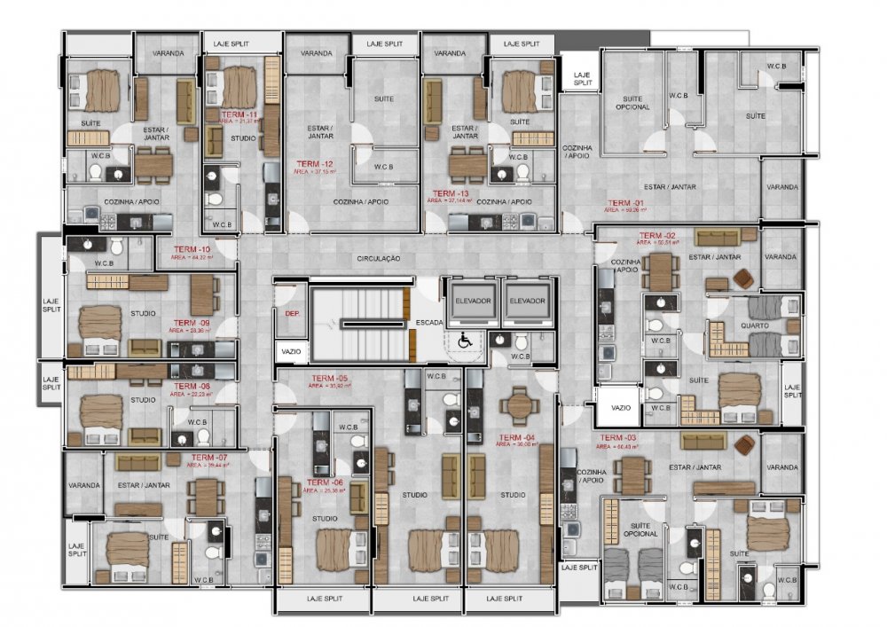 - Quarto/sala sendo 01 suíte, Sala de Estar/Jantar, Varanda, Cozinha e Área de Serviço. 37,15m²