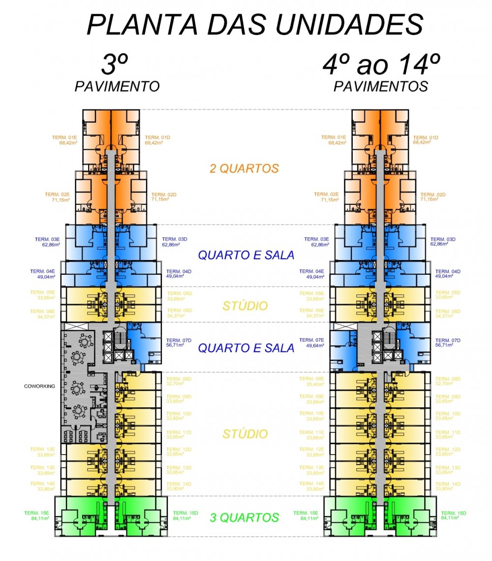 Subsolo, Pilotis com galeria de lojas, 02 Pavimentos Garagem, 14 Pavimentos Tipo com 04 apartamentos por andar e Pavimento Cobertura com área de lazer comum