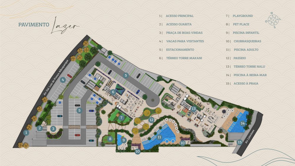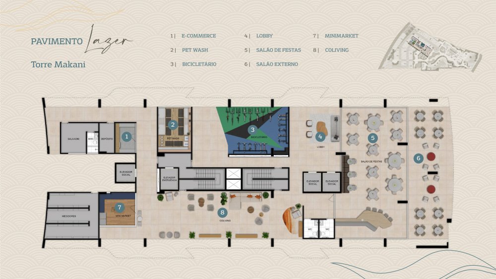 Pet washComposto por 2 torres denominadas Nalu (A) e Makani (B), Subsolo, Pilotis e 20 Pavimentos Tipo, com 08 Apartamentos por andar