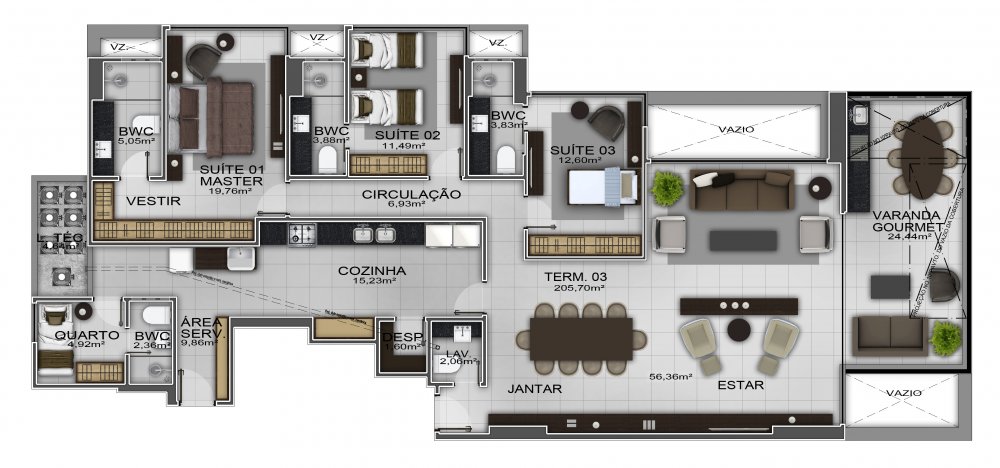 - 03 suítes sendo 01 master, DCE completa, Sala de Estar/Jantar, Varanda gourmet, Lavabo, Cozinha, Despensa e Área de serviço. 205,70m²