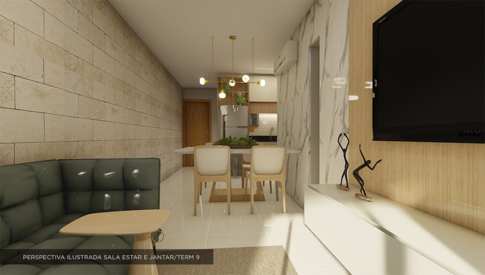 - 02 Quartos sendo 01 suíte, Sala de estar/jantar, Varanda, WC social, Cozinha e Área de Serviço. 61,50m²