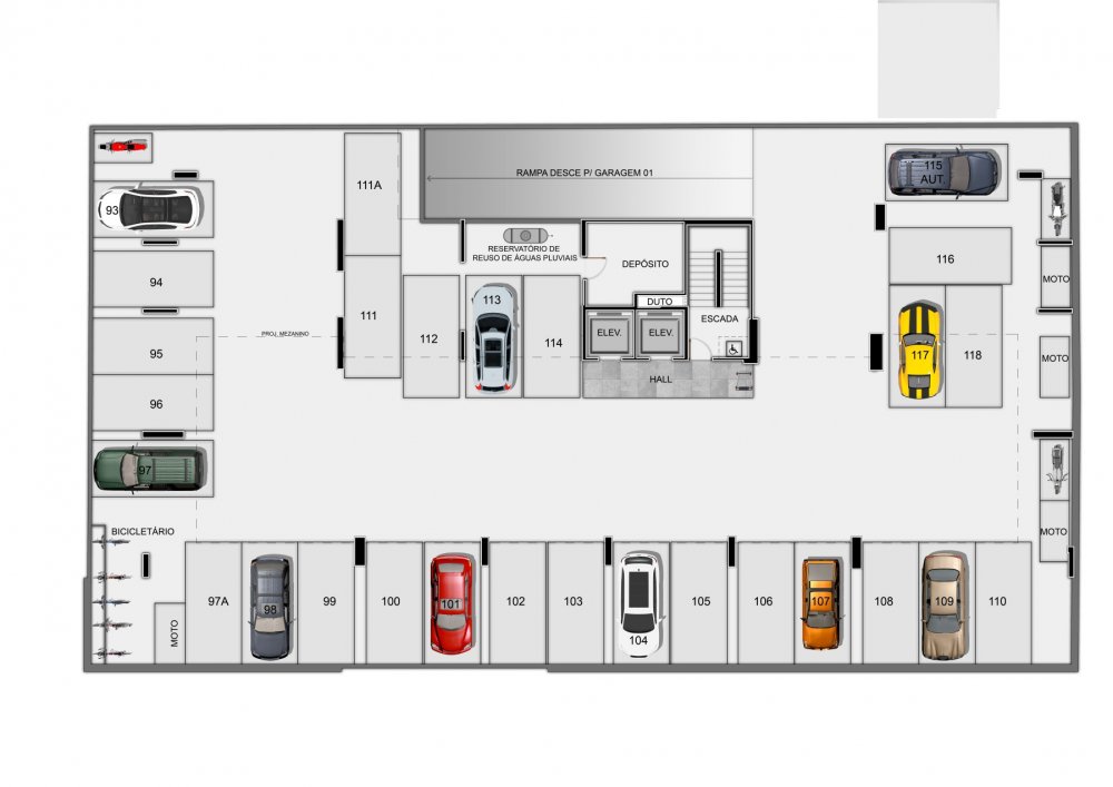 Subsolo, Pilotis, 2 Pavimentos garagem, Mezanino, Rooftop e 10 pavimentos tipo com 11 apartamentos e Pavimento cobertura com 7 apartamentos