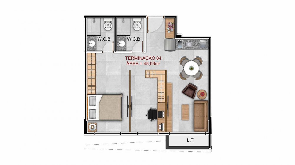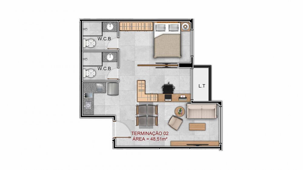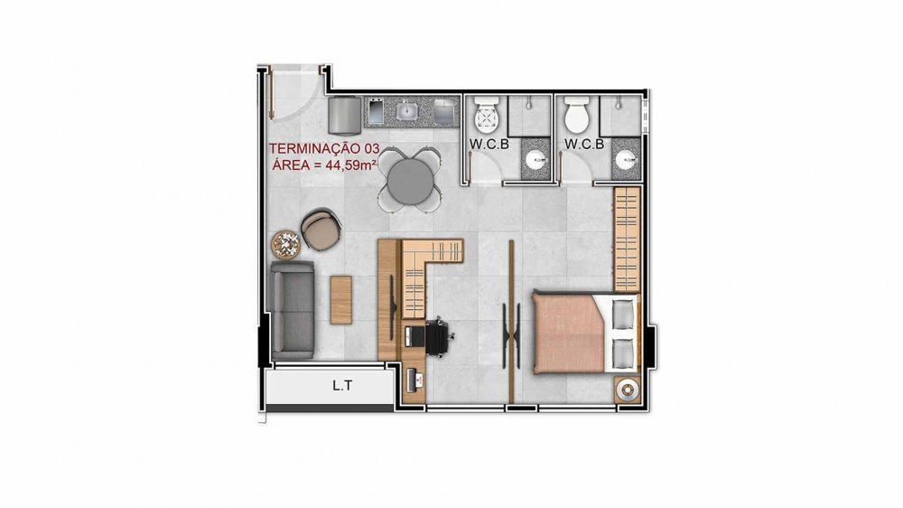 Simulação 01 a 02 quartos 46m²: