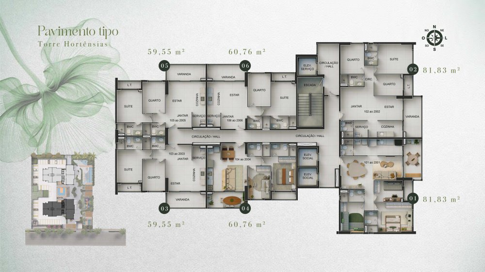 - Apartamentos 02 a 03 quartos. 59m² a 81m²